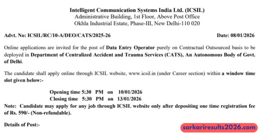 Are you hunting for a stable government job in Delhi? The Intelligent Communication Systems India Ltd. (ICSIL), a joint venture between TCIL and DSIIDC under the Government of Delhi, has rolled out an exciting opportunity. They’re hiring 50 Data Entry Operators (DEOs) for the Centralised Ambulance Trauma Services (CATS). This short-window recruitment, starting January 10, 2026, is perfect for graduates with basic computer skills. With a competitive salary of ₹24,356 per month, it’s a great entry point into public sector IT roles. For the latest sarkari results and job alerts, check www.sarkariresults2026.com.